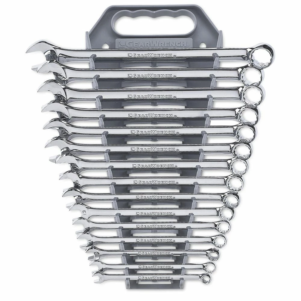 The GEARWRENCH combination wrenches are durable tools for most jobs. They are made from alloy steel with either a full polish or satin finish that resists rust & corrosion. The off-corner loading design on both ends provides a stronger grip on fasteners, reduces fastener rounding, and delivers up to 25% more torque to the fasteners. Sizes are stamped on the beam for quick, easy, & permanent identification. The box end is offset 15° for increased access to fasteners. Available in stubby & long pattern lengths and 6 & 12 point, the GEARWRENCH combination wrenches are a must have for every toolbox.