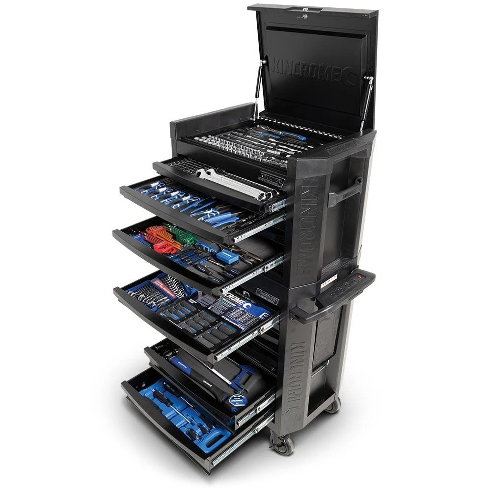 The CONTOUR® range of Tool Kits, Chests and Trolleys is our premium level range, developed for those looking for trade quality tools and features. CONTOUR® comes loaded with premium features for apprentices and professionals, combined with modern styling, offering you the very best that KINCROME has to offer. Designed in Australia by KINCROME, the CONTOUR® range features a sleek contoured design, available in a variety of gloss colours with a UV protected powder coated finish. CONTOUR® storage comes standard with a range of premium features, including; the chamfered Kincrome embossed side panels, ’Automatic Drawer Retention System (ADRS)’ locking system, heavy duty ‘Big Grip’ side carry handles and a contoured trolley handle, side folding work trays, MDF worktop and four swivel heavy duty polyurethane castors for easy manoeuvrability.