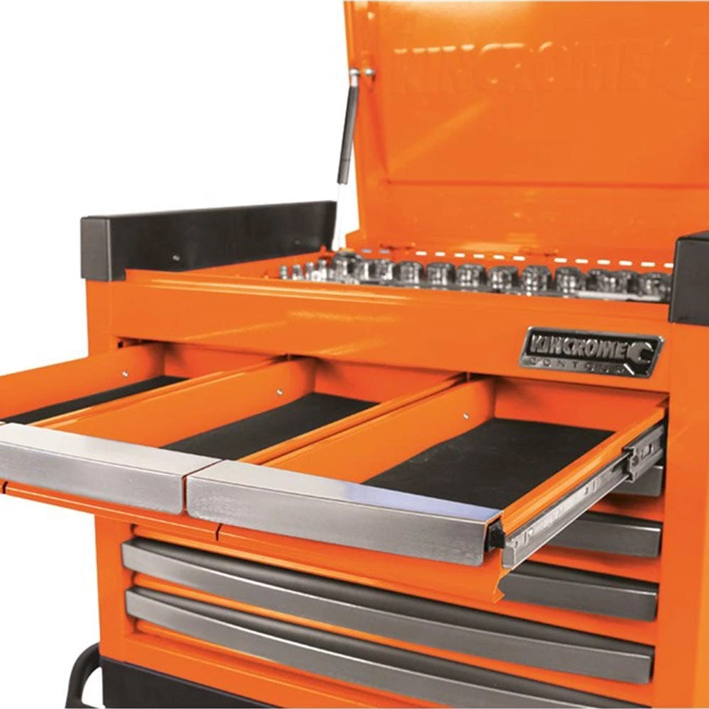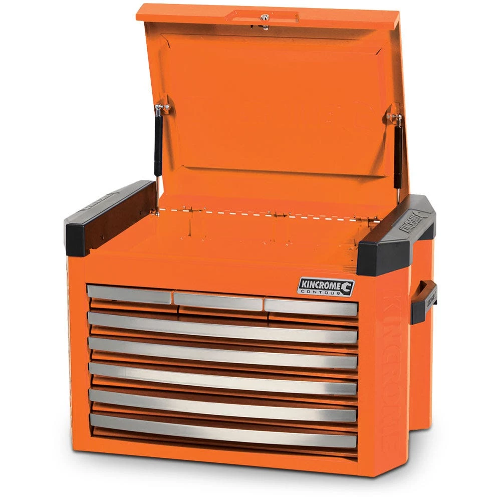The CONTOURĀ® range of Tool Kits, Chests and Trolleys is our premium level range, developed for those looking for trade quality tools and features. CONTOURĀ® comes loaded with premium features for apprentices and professionals, combined with modern styling, offering you the very best that KINCROME has to offer. Designed in Australia by KINCROME, the CONTOURĀ® range features a sleek contoured design, available in a variety of gloss colours with a UV protected powder coated finish. CONTOURĀ® storage comes standard with a range of premium features, including; the chamfered Kincrome embossed side panels, āAutomatic Drawer Retention System (ADRS)ā locking system, heavy duty āBig Gripā side carry handles and a contoured trolley handle, side folding work trays, MDF worktop and four swivel heavy duty polyurethane castors for easy manoeuvrability.