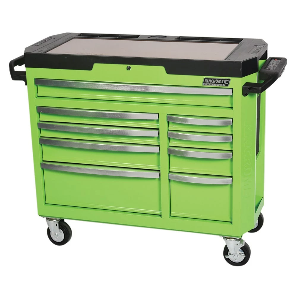 The CONTOURĀ® range of Tool Kits, Chests and Trolleys is our premium level range, developed for those looking for trade quality tools and features. CONTOURĀ® comes loaded with premium features for apprentices and professionals, combined with modern styling, offering you the very best that KINCROME has to offer. Designed in Australia by KINCROME, the CONTOURĀ® range features a sleek contoured design, available in a variety of gloss colours with a UV protected powder-coated finish. CONTOURĀ® storage comes standard with a range of premium features, including; the chamfered Kincrome embossed side panels, āAutomatic Drawer Retention System (ADRS)ā locking system, heavy duty āBig Gripā side carry handles and a contoured trolley handle, side folding work trays, MDF worktop and four swivel heavy duty polyurethane castors for easy manoeuvrability.