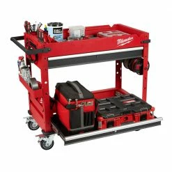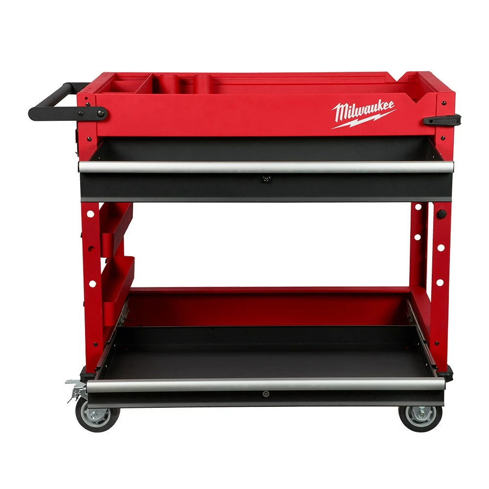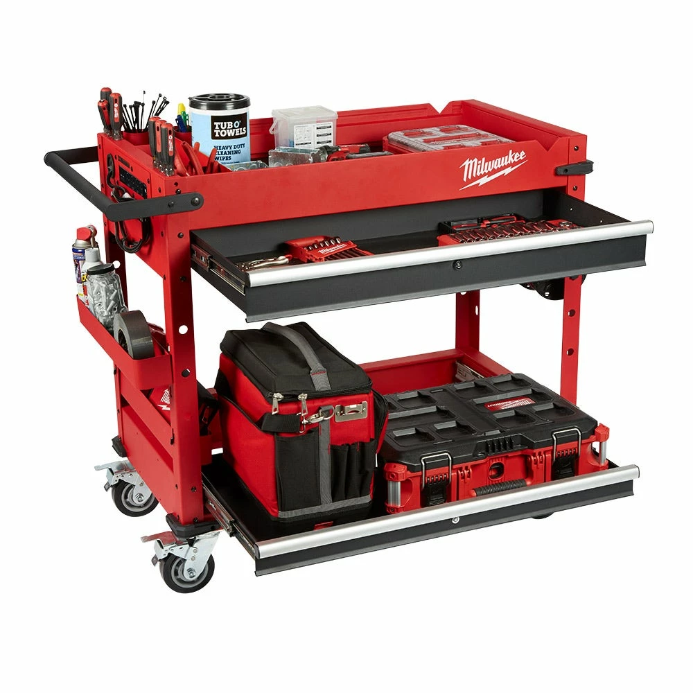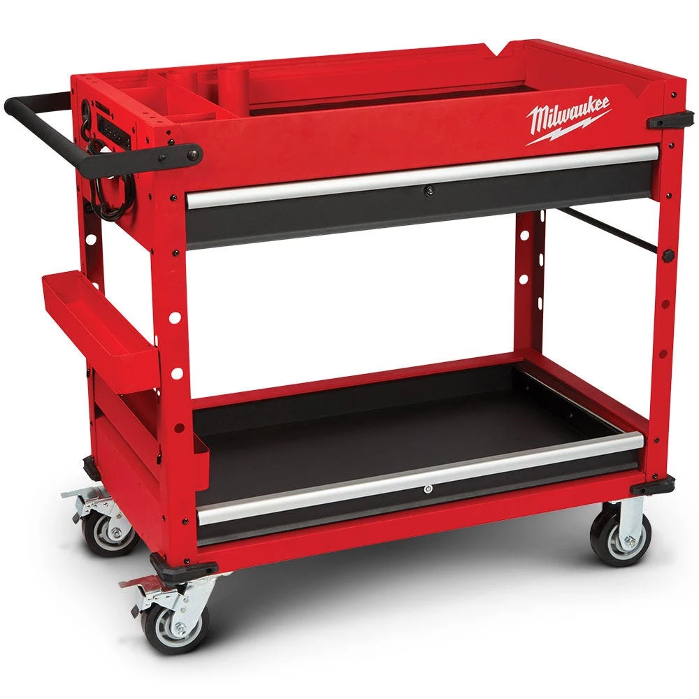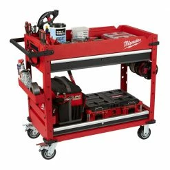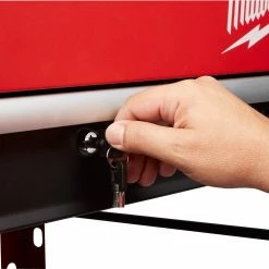 The Milwaukee’s 40inch 2-Drawer Mobile Workstation is loaded with innovative features to help accomplish your job faster and more efficiently. The large top tray supports up to 136 kg. includes a 3-section parts tray, and two removable storage cups. The cups can be flipped upside down to create a flush surface or be completely removed for vertical long tool storage. The reinforced V-groove helps keep your material in place when measuring or cutting. A convenient fold-out work tray holds laptops at a comfortable height of 914mm above the floor. Our rolling work cart is equipped with a built-in power center for you to charge electronics, tools, and battery packs with cord hooks to safely store the power cord. The sliding bottom tray with 90 kg. soft-close drawer slides allows you to easily store larger items like air compressors or MILWAUKEE® PACKOUT™ organisers. This mobile workstation has been built with the durability and storage space you need to get the job done.