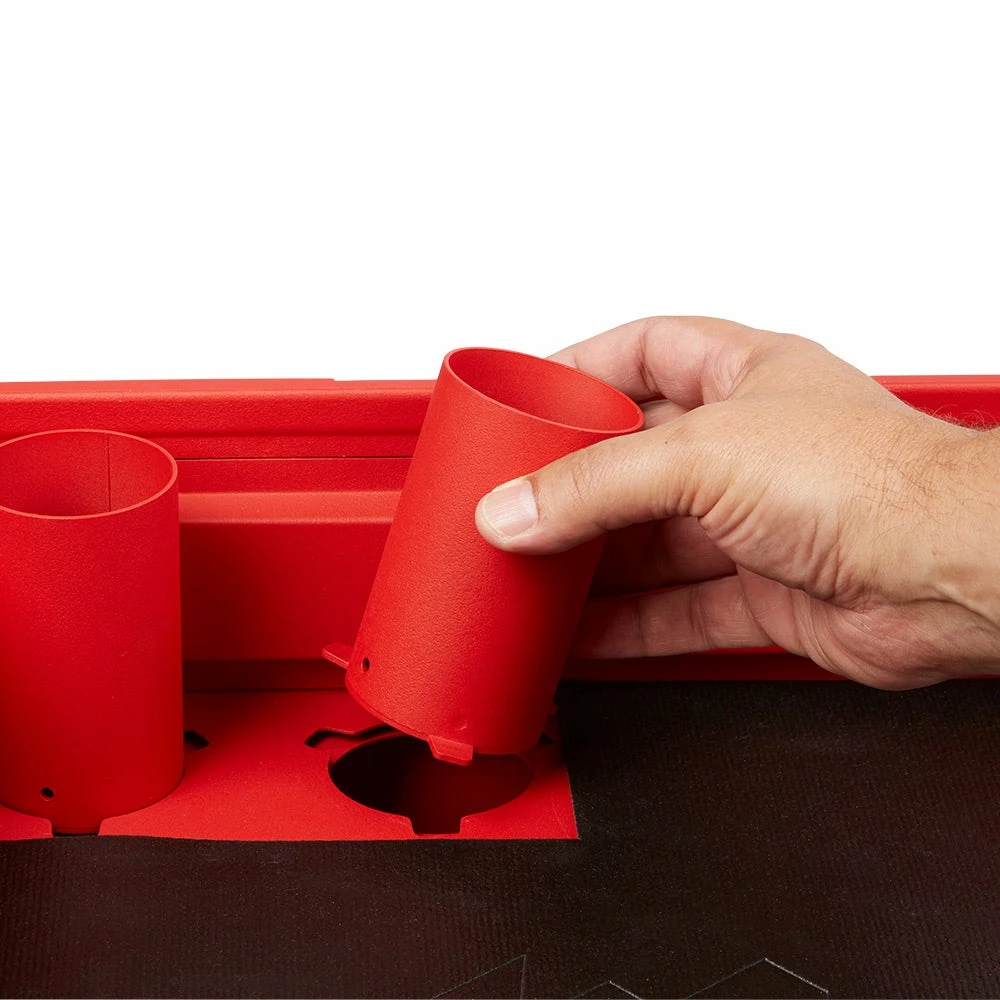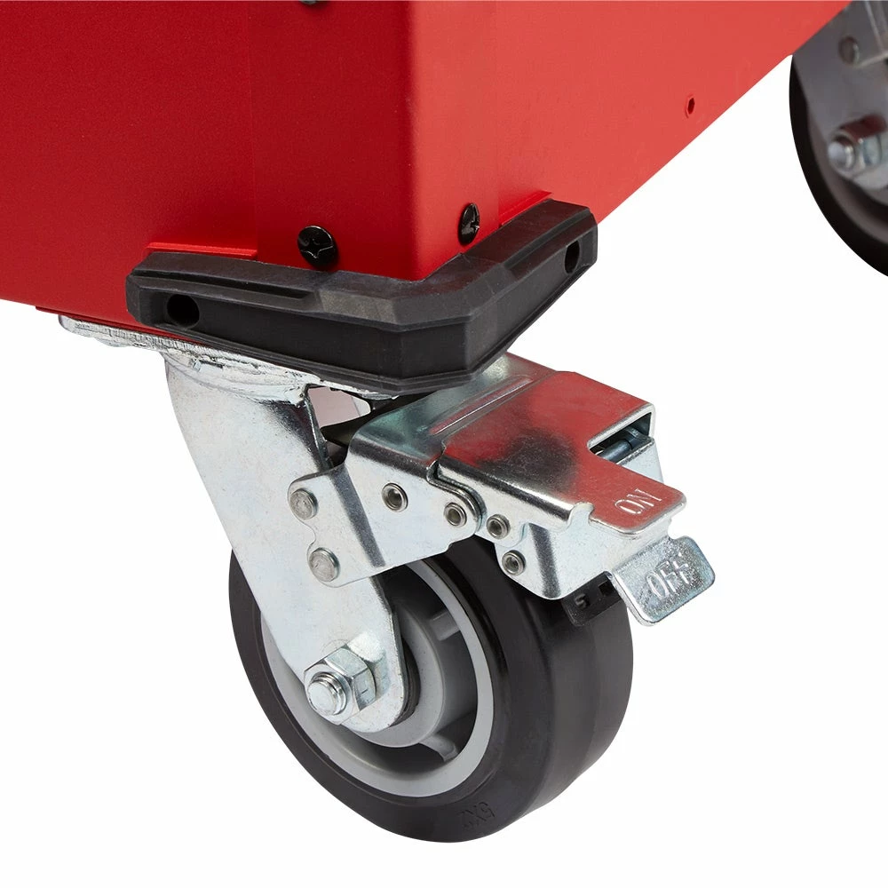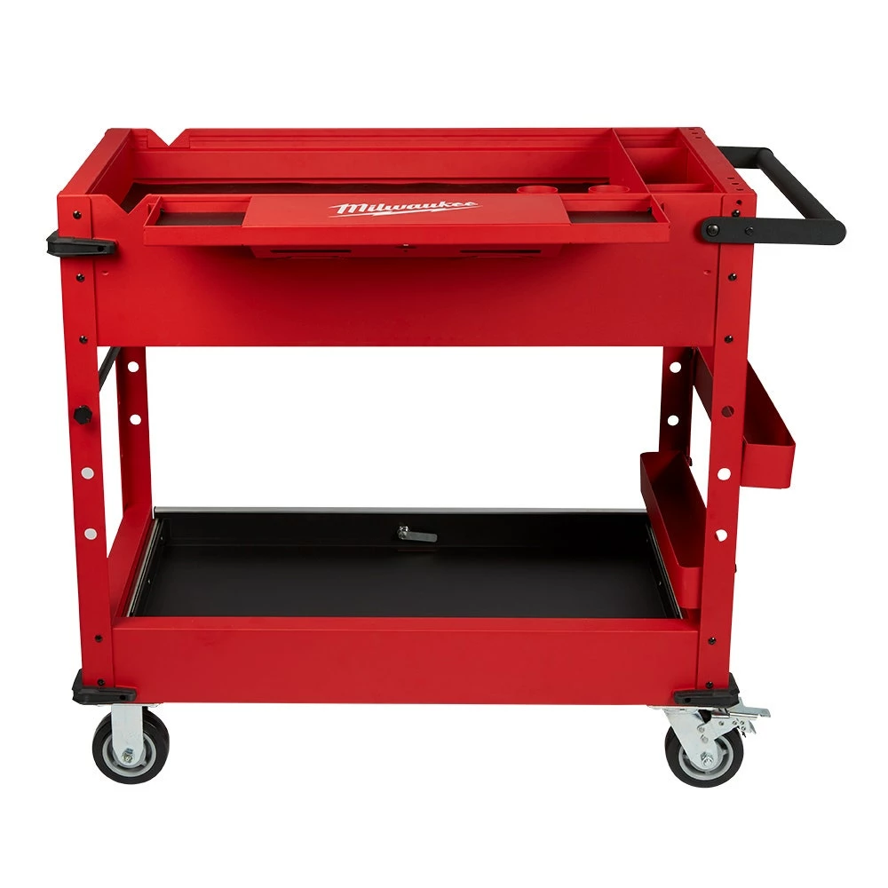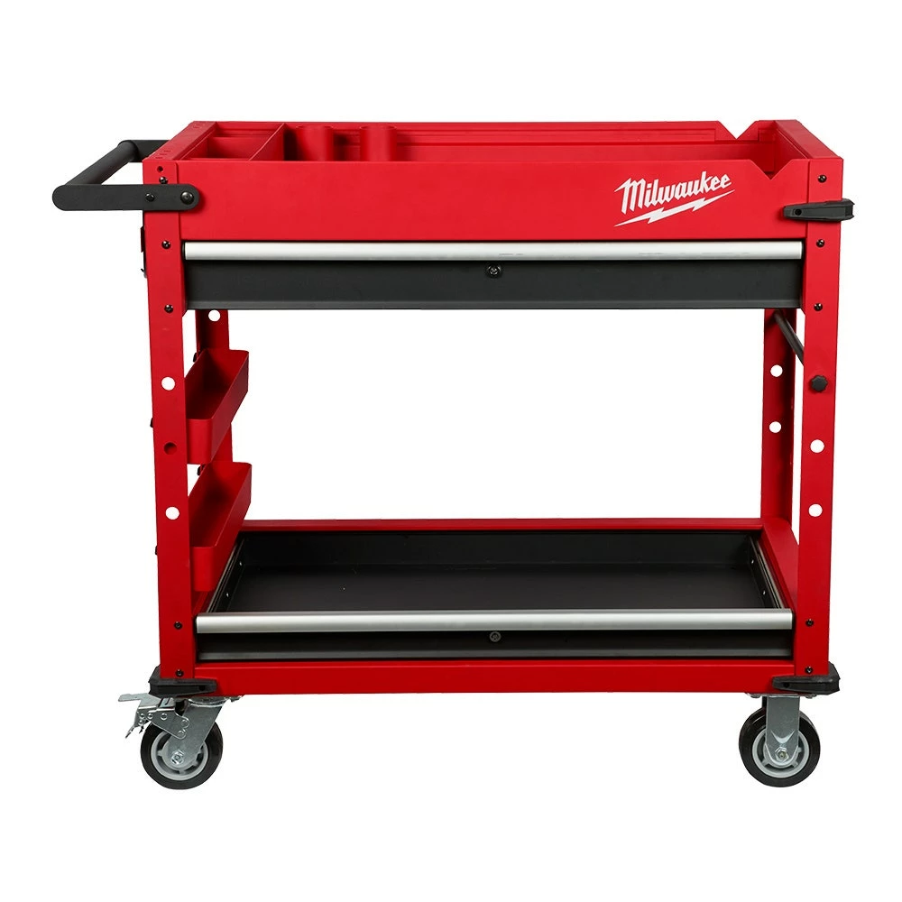 The Milwaukee’s 40inch 2-Drawer Mobile Workstation is loaded with innovative features to help accomplish your job faster and more efficiently. The large top tray supports up to 136 kg. includes a 3-section parts tray, and two removable storage cups. The cups can be flipped upside down to create a flush surface or be completely removed for vertical long tool storage. The reinforced V-groove helps keep your material in place when measuring or cutting. A convenient fold-out work tray holds laptops at a comfortable height of 914mm above the floor. Our rolling work cart is equipped with a built-in power center for you to charge electronics, tools, and battery packs with cord hooks to safely store the power cord. The sliding bottom tray with 90 kg. soft-close drawer slides allows you to easily store larger items like air compressors or MILWAUKEE® PACKOUT™ organisers. This mobile workstation has been built with the durability and storage space you need to get the job done.