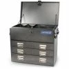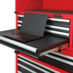 Keep all your power tools powered up even while the unit is locked with the integrated 6 outlet/2 USB power center in the top till. Easily use and store your laptop or paperwork in the innovative pullout work surface drawer. Barrel key locking system secures all your valuables and there is a separate privacy drawer that can be locked while the rest of the drawers remain open. The 68kg rated, soft-close, ball bearing drawer slides gently retain the drawers from accidental opening or slamming shut.