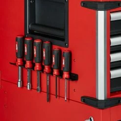 The next generation of Milwaukee high capacity steel tool storage is here. The 8-drawer chest is an extra-deep 558mm (22″), which is 101mm (4″) deeper than most other units. The chest lid has 266mm (10.5″) clearance and a thick top mat with a Milwaukee-embossed logo. The extensive list of features includes an integrated peg wall in the chest, paper towel holder, two J-hooks to store your hoses and cords, and stylish aluminum edge guards with rubber corner bumpers to help protect your investment.